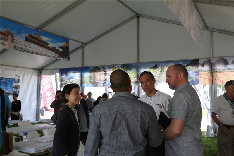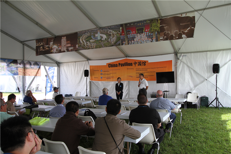 中国馆由世兴公司, 美国大使馆商务处, 民航报道以及中国航空运输协会通航委员会共同举办。 其中团员包括, 民航总局,中国民航管理学院,中国民航工程咨询公司等一行共30人。在此期间,EAA的政府事务负责人,Barry Valentine 先生来到中国馆为招商会开幕剪彩并发言,该招商会是由中国馆协助河南省郑州通用航空实验区, 河南啸鹰航空以及道和通航进行招商活动以及宣传。赵嘉国先生代表中国馆接待来自国内的航空业界领导来飞来者大会访问交流。